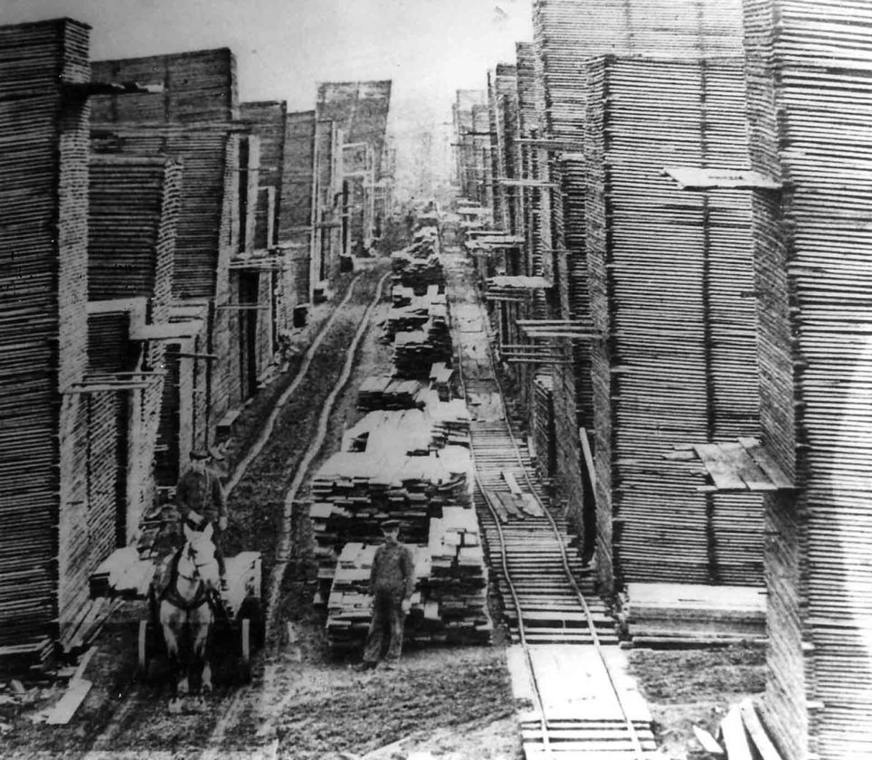 Photo from historical society archives Stacks of sawed boards are drying in the vast lumber yard of the Parkersburg Mill Company. This was the largest lumber mill in the area.