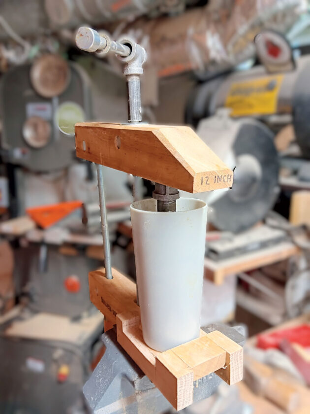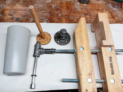 I had another idea. When I was a little kid, I helped my grandfather make wine in the cellar where he built a press into the wall to squeeze grapes. I needed such a press. I modified an old hand screw, which is a woodworker’s clamp. I drilled a hole in a handle for a cross lever to give me more torque. However, the wooden handle eventually failed and I made another from 3/8 black pipe fastened to the spindle of the clamp with a hardened steel rivet. An old handle from a vice through the pipe completed things.