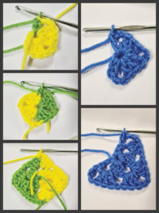 Before I share the patterns, here are a few notes. First, I hold my starting yarn with my ring. Each square starts with the first half of a corner, then close it with (ch1, hdc in top of Beg ch-2). Half squares include stitch past the edge corner on each side. Lastly, diagonal two colored squares require you to turn your work each round.