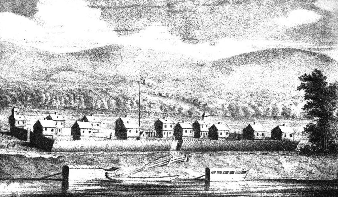 Two-story block houses were constructed in a group near the banks of the Ohio River. A total of 13 block houses were built arranged in two rows with a wide street between them. Pickets made from 14-foot logs between each house made for a defensible community. Gates were closed each night around the 80 rods by 6 rods (1,320×99 feet) fortress.
