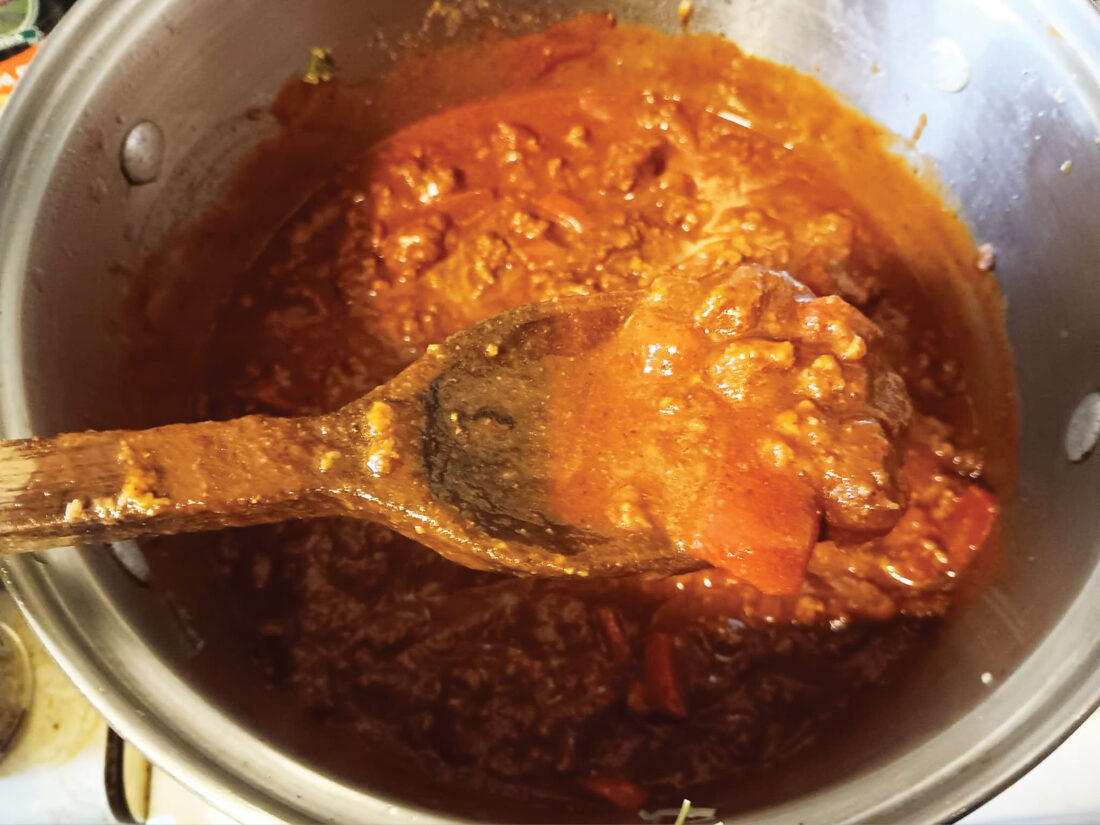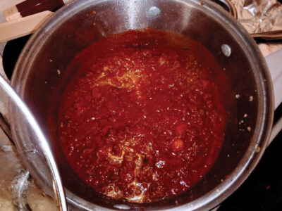 - A pot of Mancini’s regular chili. I also made the wooden spoon from walnut, by the way. (Photo by Jess Mancini)