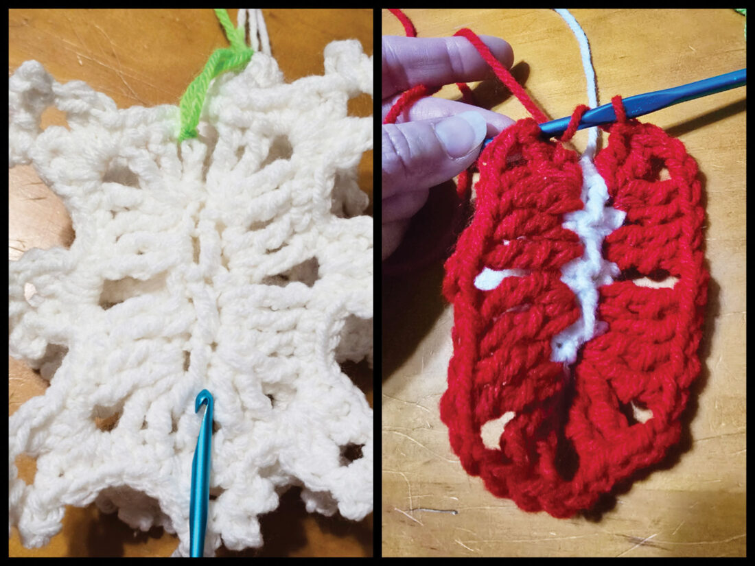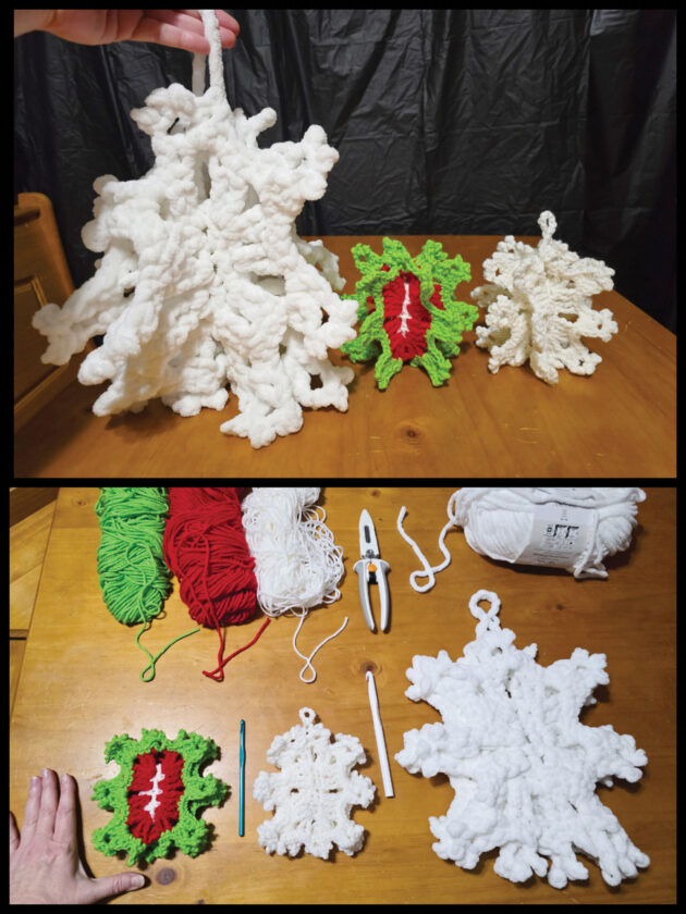 - Completed snowflakes: regular, multicolor and blanket yarn. (Photo by Maurita Way)