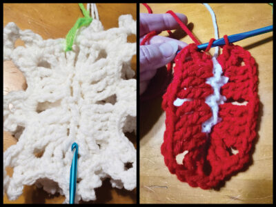 Completed snowflakes: regular, multicolor and blanket yarn. (Photo by Maurita Way)