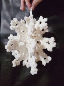 HANGER: after last “small spike,” Sc in 1st Sc of Row2, ch12, slip stitch in 5th chain, ch5, Sc in ch-2 space across opening on top of snowflake. Fasten off and hide yarn tails.