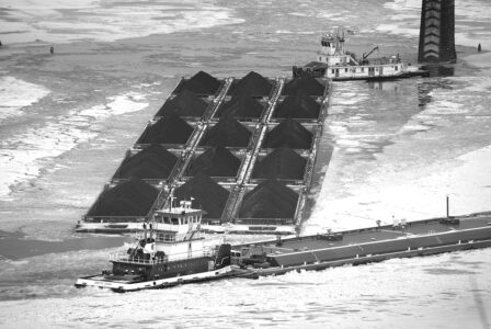 A pair of towboats work to free a string of coal barges from the ice of the Ohio River between Parkersburg and Belpre in 2018. (Photo Provided)