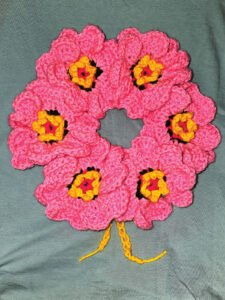 FINISHING DETAILS: I like to sew in the yarn tails a bit, making sure crochet is not pulled tight, then knot 4 times before cutting. I chose to use a crocheted chain to lace my wreath onto the wire frame. I also needed to lay the petals flat in a spiral fashion so it looked prettier.