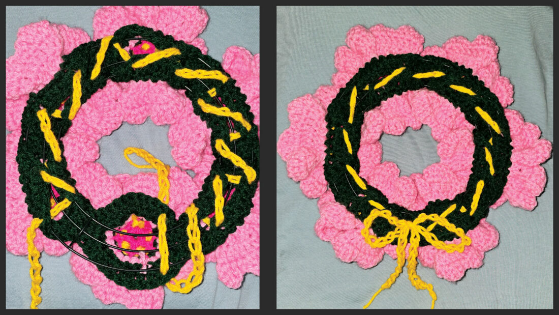 MATERIALS: Wreath: 8-inch wire frame, yarn needle, size H 5mm hook and worsted weight yarn.