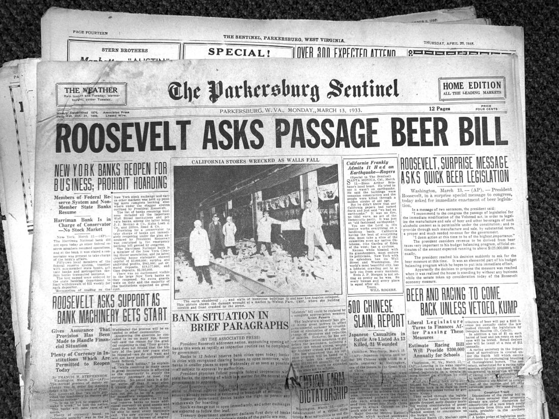The front page from The Parkersburg Sentinel of March 13, 1933, has the remarkable headline ROSEVELT ASKS PASSAGE BEER BILL across the top of the front page. This wasn’t a slow news day. There was also a story about the plan to reopen the banks that had been closed to stop an ongoing run on the bank.