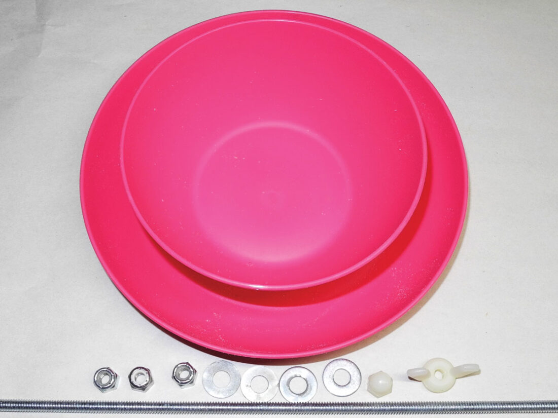 - Materials to make this bird feeder are a plastic bowl and plate, top, and, from left, three nylon lock nuts, four washers, a cap nut, a wingnut and, bottom, a 1/4 inch threaded rod. (Photo by Jess Mancini)