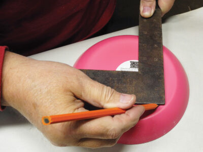 Using a square to find the center of a circle, in this case a plate. The procedure is described in the text. (Photo by Jess Mancini)