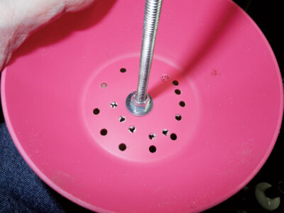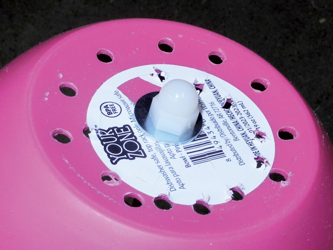 - The bottom of the feeder shows the tightened cap nut with washer. The holes are for rain water drainage. (Photo by Jess Mancini)