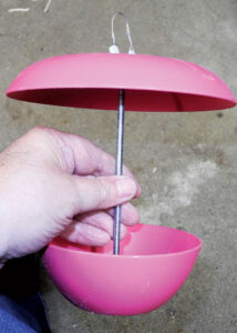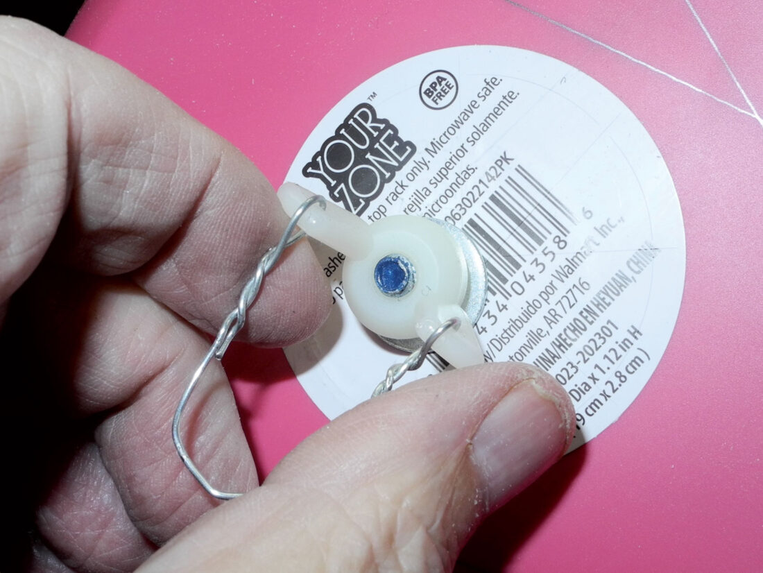 - The top of the feeder shows how the wire is attached through the holes drilled in the plastic wingnut. (Photo by Jess Mancini)
