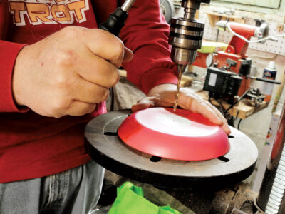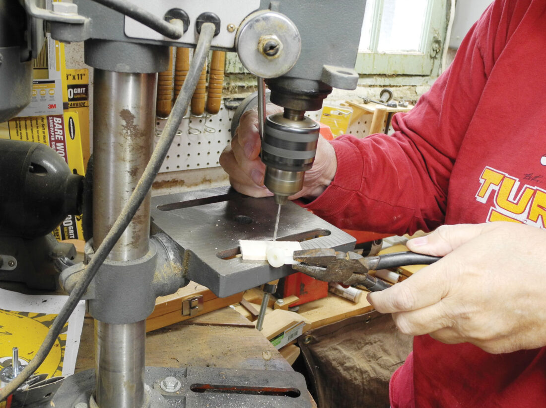 - I use a smaller drill press to drill the small hole in the wings of the wing nut. (Photo by Jess Mancini)