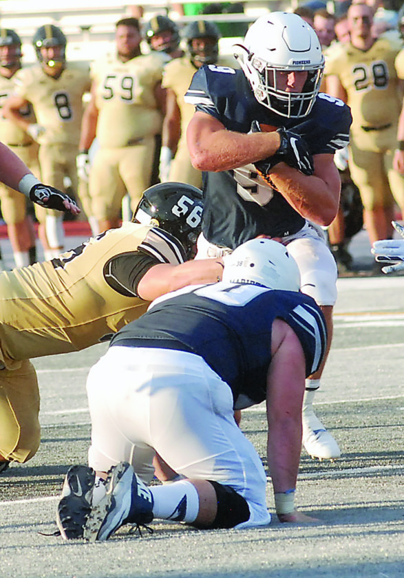 Photo by JORDAN HOLLAND Marietta College’s Tanner Clark (9) carries the ball during a college football game Saturday against Geneva at Don Drumm Stadium. Marietta won, 35-24.