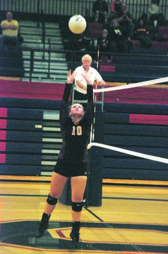 Photo by Tyler Bennett Williamstown’s Kyndra Johnson sets the ball during the Wood County Middle School Volleyball championship game Tuesday night inside the Rod Oldham Athletic Center.