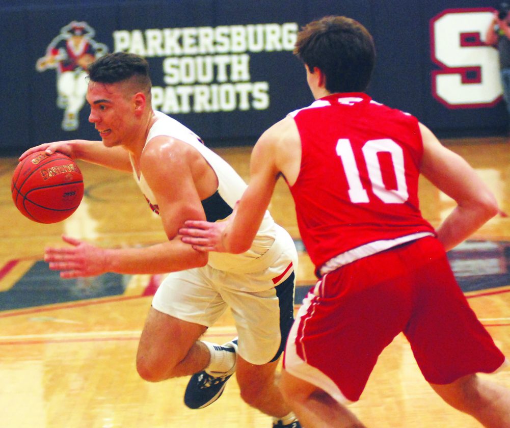 Photo by Josh Hughes Parkersburg South’s Malaki Sylvia, left, dribbles past Chris Farson (10) during a high school boys basketball game Friday night at Rod Oldham Athletic Center. Sylvia finished with a game-high 21 points in South’s 70-52 win.