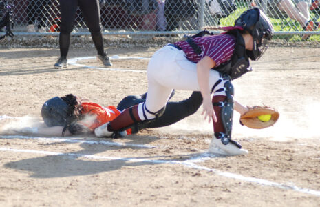 - Wirt County catcher Kylee Ross tags out Williamstown’s Kyla Myer following a strikeout during the Tigers’ 7-5 road setback on Thursday. (Photo by Jay W. Bennett)