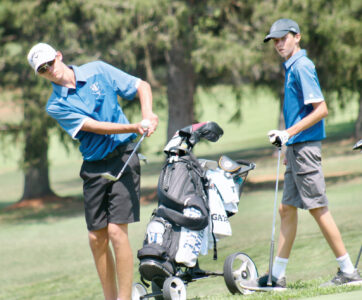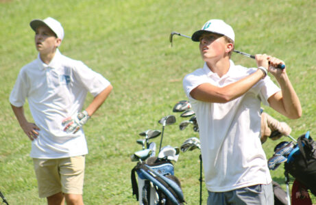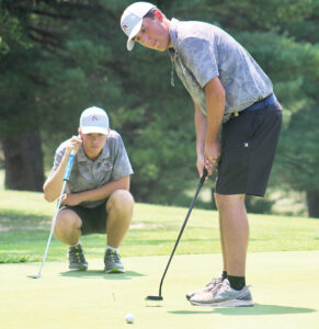 - Roane County’s Lucas Hall, right, follows the path of his putt on the ninth hole during Tuesday’s Little Kanawha Conference Scramble at North Bend Golf Course. (Photo by Kerry Patrick)