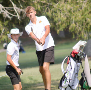 - Parkersburg Catholic’s Carson Logston hits his approach shot on the first hole during Tuesday’s Little Kanawha Conference Scramble at North Bend Golf Course. (Photo by Kerry Patrick)