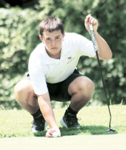 Williamstown’s Toby Thompson lines up his putt on the second green during Tuesday’s Little Kanawha Conference Scramble at North Bend Golf Course. (Photo by Kerry Patrick)