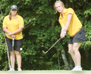 - Wirt County’s Wyatt Boice putts on the ninth green with teammate Baylee Sims watching in the background during Tuesday’s Little Kanawha Conference Scramble at North Bend Golf Course. (Photo by Kerry Patrick)