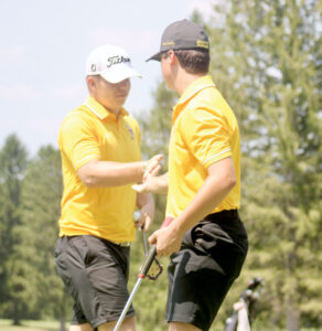 St Marys sophomore Tripp Morrison congratulates teammate Trent Renee after Renner made a birdie putt on the ninth hole at North Bend Golf Course. (Photo by Kerry Patrick)