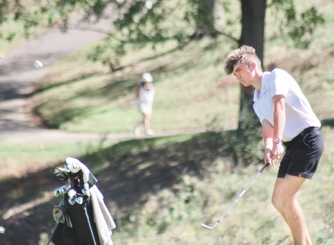 - St. Marys’ Preston Lawhon chips from the No. 13 fairway during Wednesday’s state tournament. Lawhon made birdie on the hole. (Photo by Kerry Patrick)
