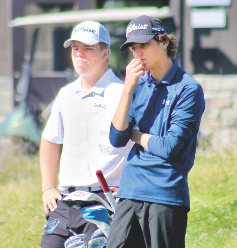 - St. Marys’ Trent Renner, left, and Gilmer County’s Seth Stewart chat between shots during Wednesday’s state tournament. (Photo by Kerry Patrick)