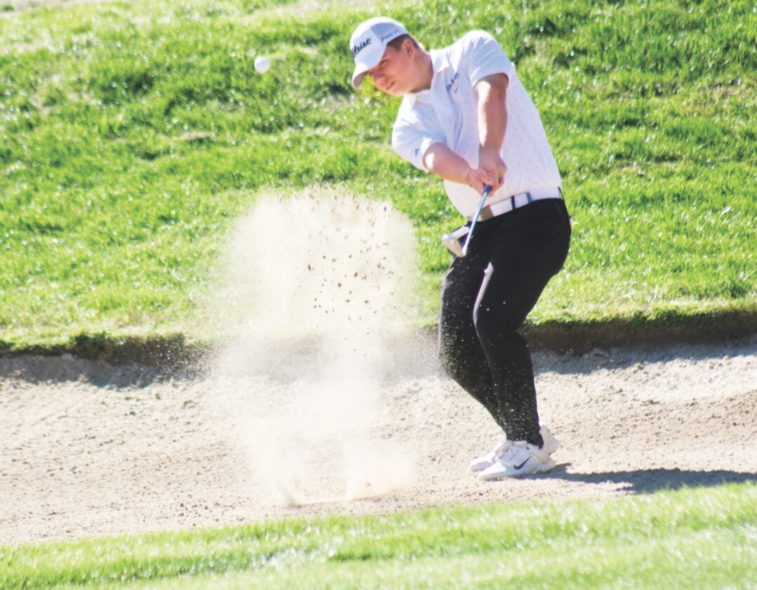 - St. Marys’ Trent Renner hits out of the greenside bunker on No. 13 during Wednesday’s state tournament. (Photo by Kerry Patrick)