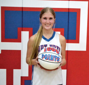 - Fort Frye senior Emmie Duskey celebrates after scoring her 1,000th career point in the Cadets’ win over Shenandoah Monday in Beverly. (Photo by Mike Morrison)
