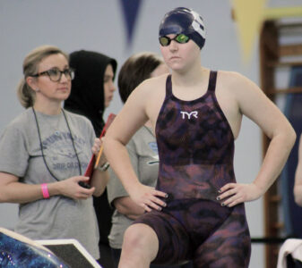 - Doddridge County’s Isabella McGrady prepares for the start of the 100 breaststroke preliminary heat during Friday’s West Virginia High School State Swim Meet in Morgantown. (Photo by Kerry Patrick)