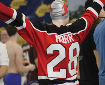 - Parkersburg’s Levi Morr sports the hockey jerseys worn by the Big Reds swim team at the West Virginia High School State Swim Team in Morgantown. (Photo by Kerry Patrick)