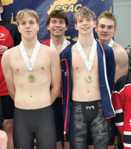 Parkersburg South’s 4x400 relay placed third during Friday’s West Virginia High School State Swim Meet in Morgantown. Pictured are Quade Harris (lower left), Jantzen Karcher (lower right), Connor Roberts (upper left) and Remington Blair (upper right) (Photo by Kerry Patrick)