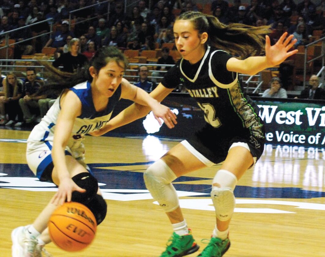 - Gilmer County’s Allie Ellyson, pictured here being guarded by Tug Valley’s Kenzie Browning, was named tournament MVP after helping the Titans to the Class A state championship following a 66-22 blowout of the Panthers on Saturday night in Charleston. (Photo by Jay W. Bennett)