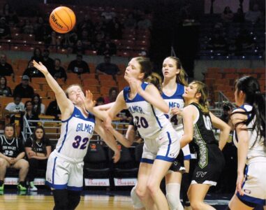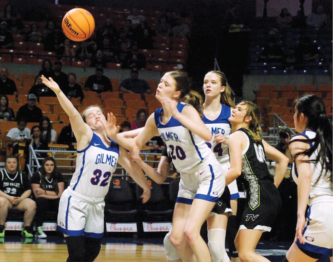 - Gilmer County’s Blair Dobbins (20), Ava Dobbins (24) and Malory Casteel (32) go after a rebound during the Titans’ 66-22 blowout of Tug Valley during Saturday night’s Class A state championship game in Charleston. (Photo by Jay W. Bennett)