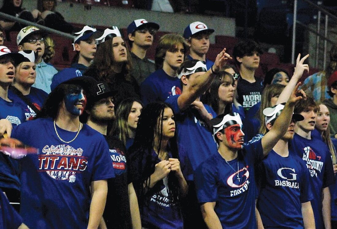 - The Gilmer County student section looks on during the Titans’ 66-22 blowout of Tug Valley during Saturday night’s Class A state championship game in Charleston. (Photo by Jay W. Bennett)