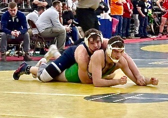 - St. Marys’ Kyle Bullman (120) gets a pin over Ravenswood’s Jerry Rhodes in 2:26 during state tournament competition Thursday in Huntington. (Photo Provided)