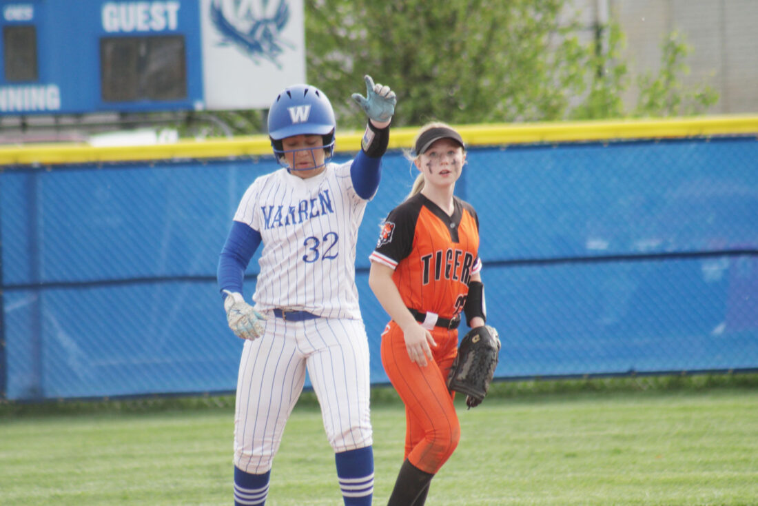 - Warren’s Jayda Murray signals to her teammates after hitting a second-inning double during Tuesday’s game against Marietta in Vincent. (Photo by Kerry Patrick)