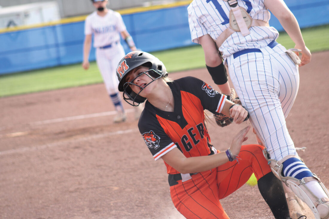 - Marietta’s Claire Bills makes contact with the Warren catcher while sliding into home plate as part of a four-run fourth inning during Tuesday’s game in Vincent. (Photo by Kerry Patrick)