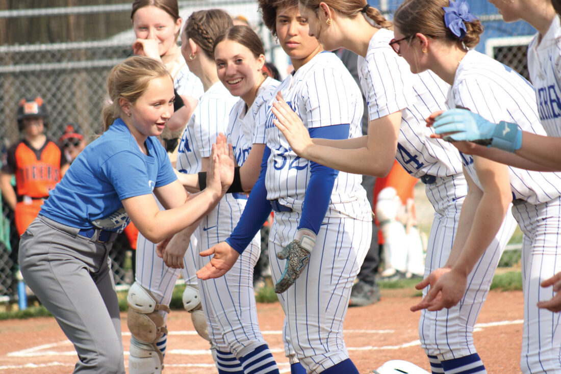 Tuesday’s high school softball game between Marietta and Warren in Vincent recognized Youth Night for girls in the Warren school system. Among those greeting the Warren High School players prior to the game is Micah Edgell, left. (Photo by Kerry Patrick)
