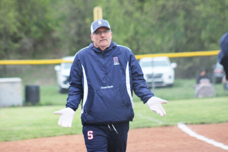 - Parkersburg South softball coach Tim Burch asks for clarification from the home plate umpire during Tuesday’s 1-0 win over Wheeling Park at Godbey Field. (Photo by Kerry Patrick)