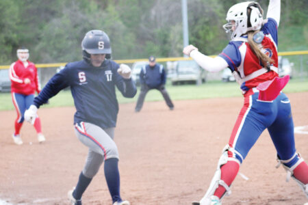 - Parkersburg South baserunner Emma Kuhl, left, scores the game’s only run in the bottom of the sixth inning as Wheeling Park catcher Kyla Cunningham attempts to haul in a high throw on a force play at home plate, Tuesday at Godbey Field. (Photo by Kerry Patrick)