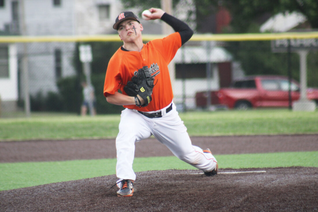 - Marietta starting pitcher Cooper Laumann delivers a pitch during the TIgers 6-1 loss to Parkersburg, Thursday at Bennett Stump Field. (Photo by Kerry Patrick)