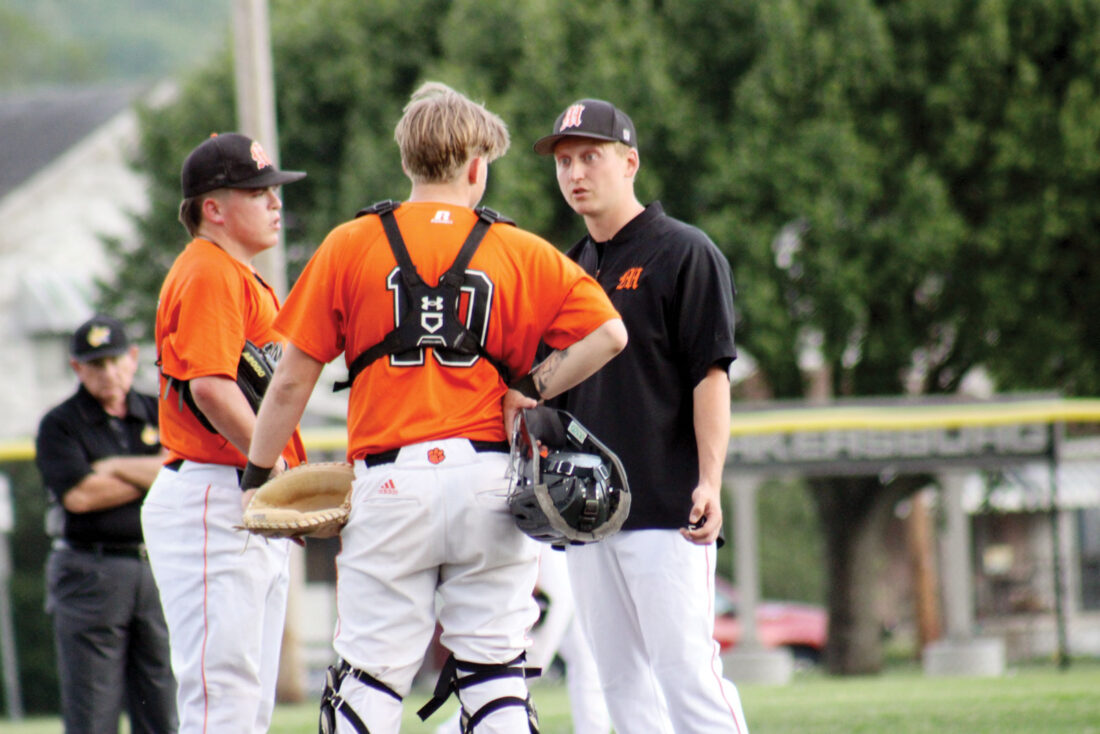 Marietta baseball coach Kail Hill, right, talks to his catcher Bryson Chidester (10) and pitcher Cooper Laumann during a mound visit during Thursday’s game against Parkersburg at Bennett Stump Field. (Photo by Kerry Patrick)