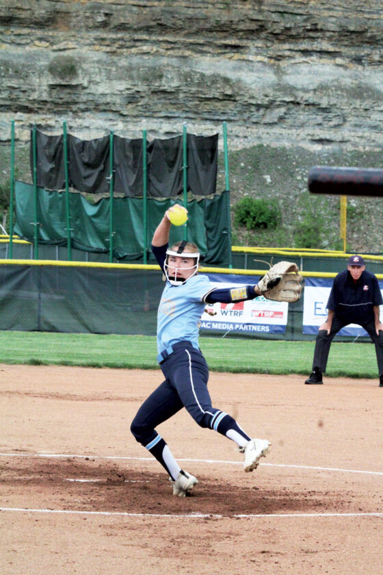 Frontier’s Kaycee Berentz delivers a pitch during the Ohio Valley Athletic Conference 1A championship against Conotton Valley Friday in Wheeling. (Photo by Nick Henthorn)