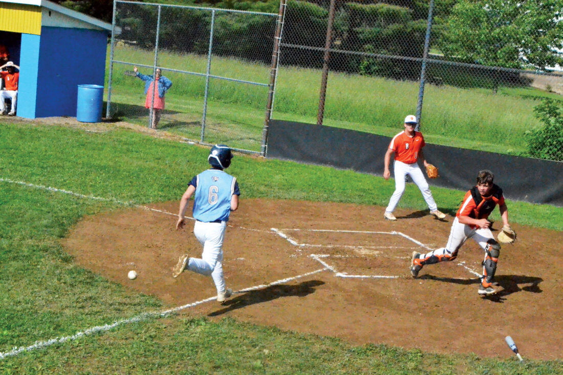 Frontier’s Brayden Powers (6) sprints toward home as Belpre catcher Blake Binegar awaits a throw during a high school baseball game Wednesday in New Matamoras. (Photo by Mike Morrison)