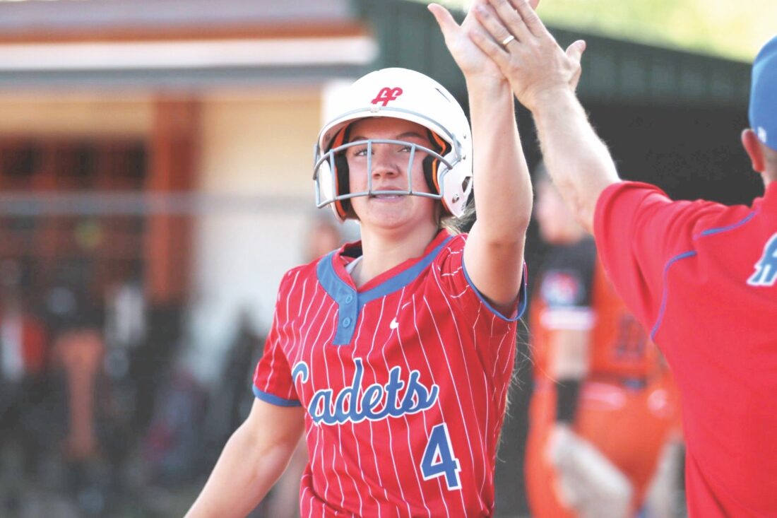 Fort Frye’s Ella Dowler celebrates with head coach Brian Duskey after hitting an inside-the-park grand slam in the Cadets’ 14-3 win over Marietta Monday. (Photo by Beth Smith)