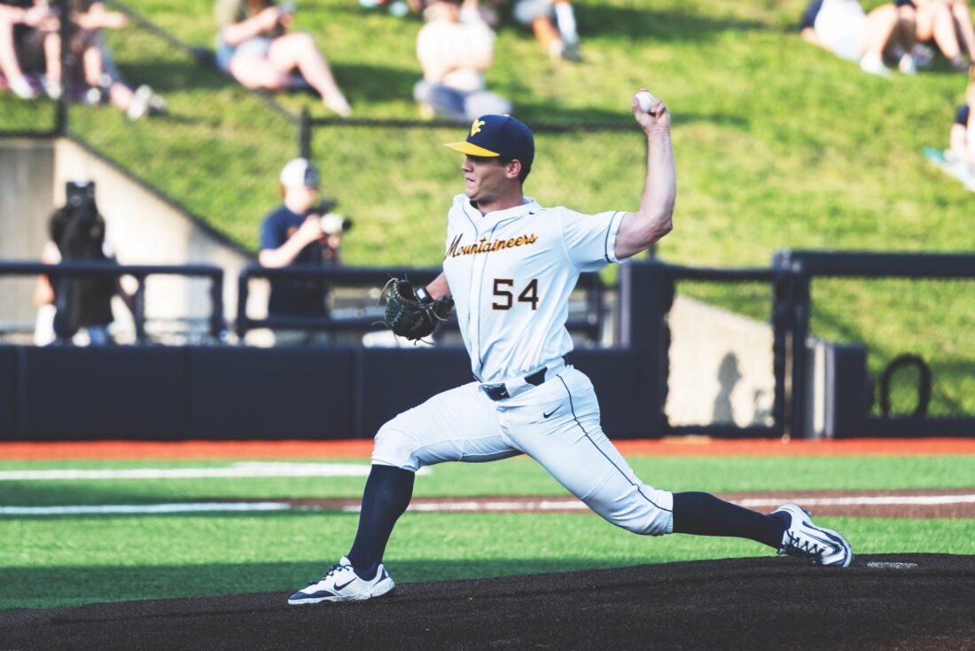 West Virginia pitcher Griffin Kirn delivers a pitch during Thursday’s game against Kansas. (Photo by Cassidy Roark/The Dominion Post)