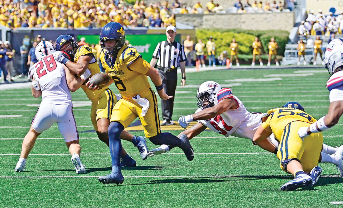 West Virginia quarterback Nicco Marchiol carries the ball during last week’s game against Robert Morris in Morgantown. (Photo by David Pennock)