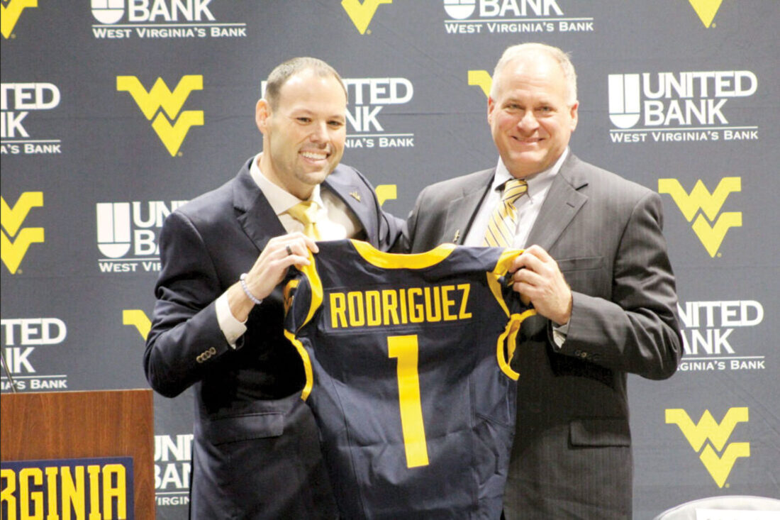 West Virginia Athletic Director Wren Baker welcomes Rich Rodriguez back to the university. (Photo by Damian Phillips/BlueGoldNews.com)
